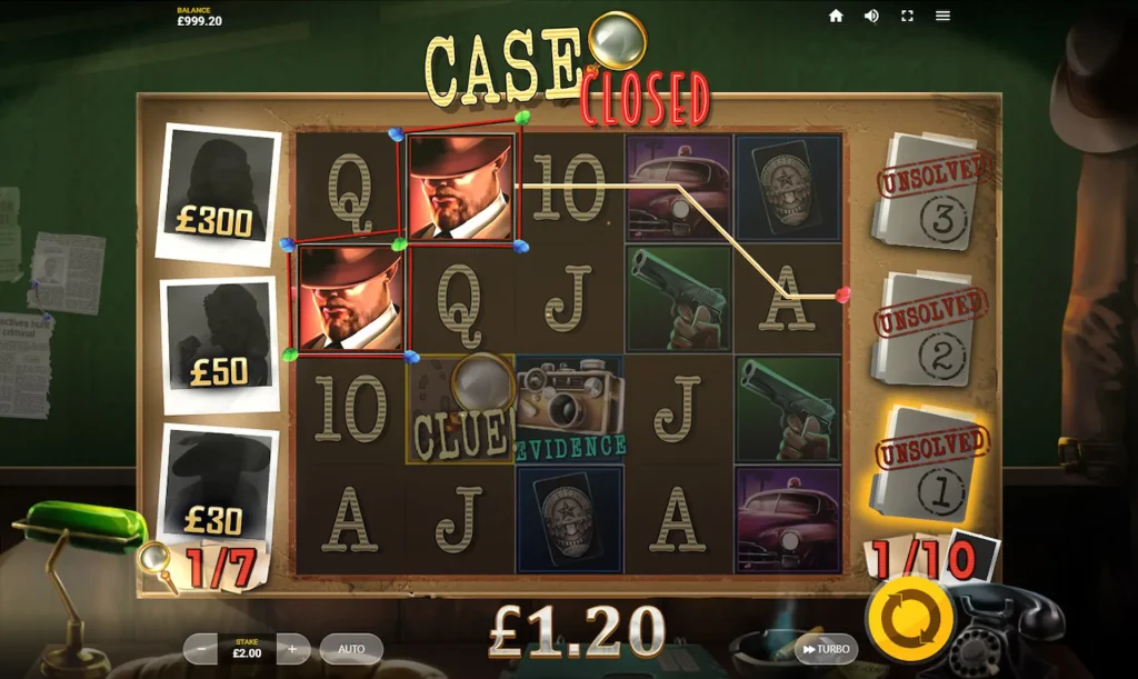 Los símbolos de las pruebas te ayudarán a resolver 3 casos, y cada caso resuelto te proporcionará una ventaja invaluable para tu próximo interrogatorio. ¿Estás listo para conseguir hasta x2000? En Case Closed, debes reunir pistas y pruebas para resolver el crimen.