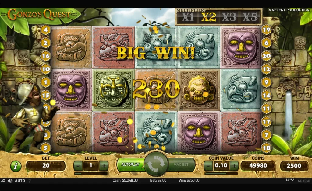 Gonzo’s Quest tiene un RTP teórico del 96%, lo que lo coloca en la categoría promedio de tragaperras online con una variación entre media y alta.